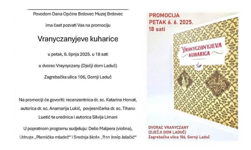 U petak, 6. lipnja u 18 h u Dvorcu Vranyczany (Dječji dom Laduč), na adresi Zagrebačka 106, Gornji Laduč bit će predstavljena Vranyczanyjeva kuharica. Povodom tog događaja u emisiji Jutro na zapadu ugostili smo ravnateljicu Muzeja Brdovec, Silviju Limani koja nam je rekla nešto više o tome.